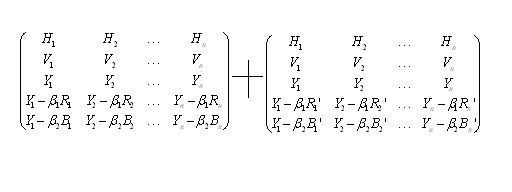 而現(xiàn)在的偽立體電視是由行向量H,幀向量V,亮度向量Y組成的三維線性空間。表達(dá)彩色信息的是由紅向量R,R',綠向量G,G',蘭向量B,B'組成的。共有H,V,Y,R,G,B,R',G',B'九個(gè)向量,通過不同的線性組合,組成的三維線性空間。可用以下左右二個(gè)的矩陣來表示: