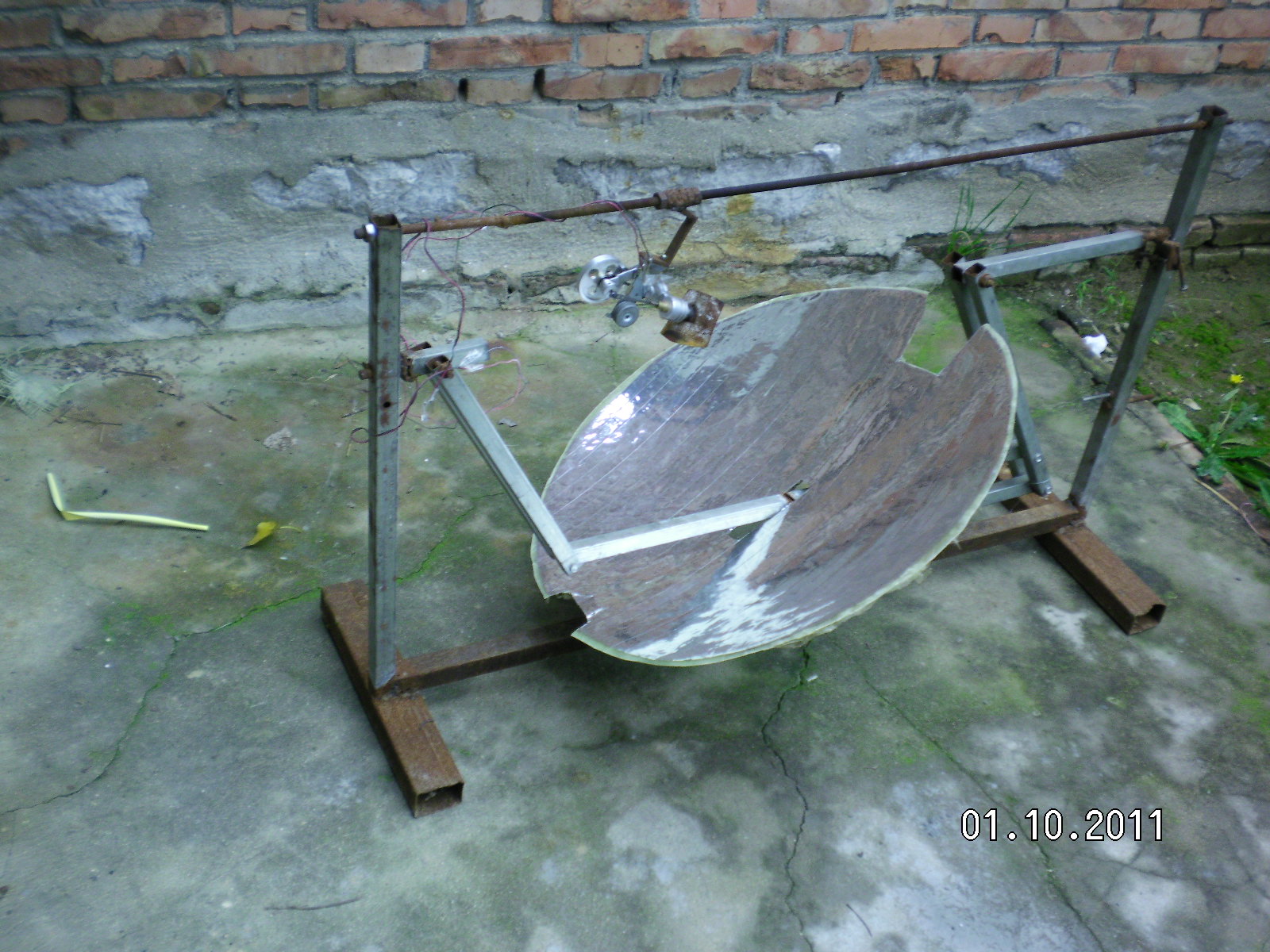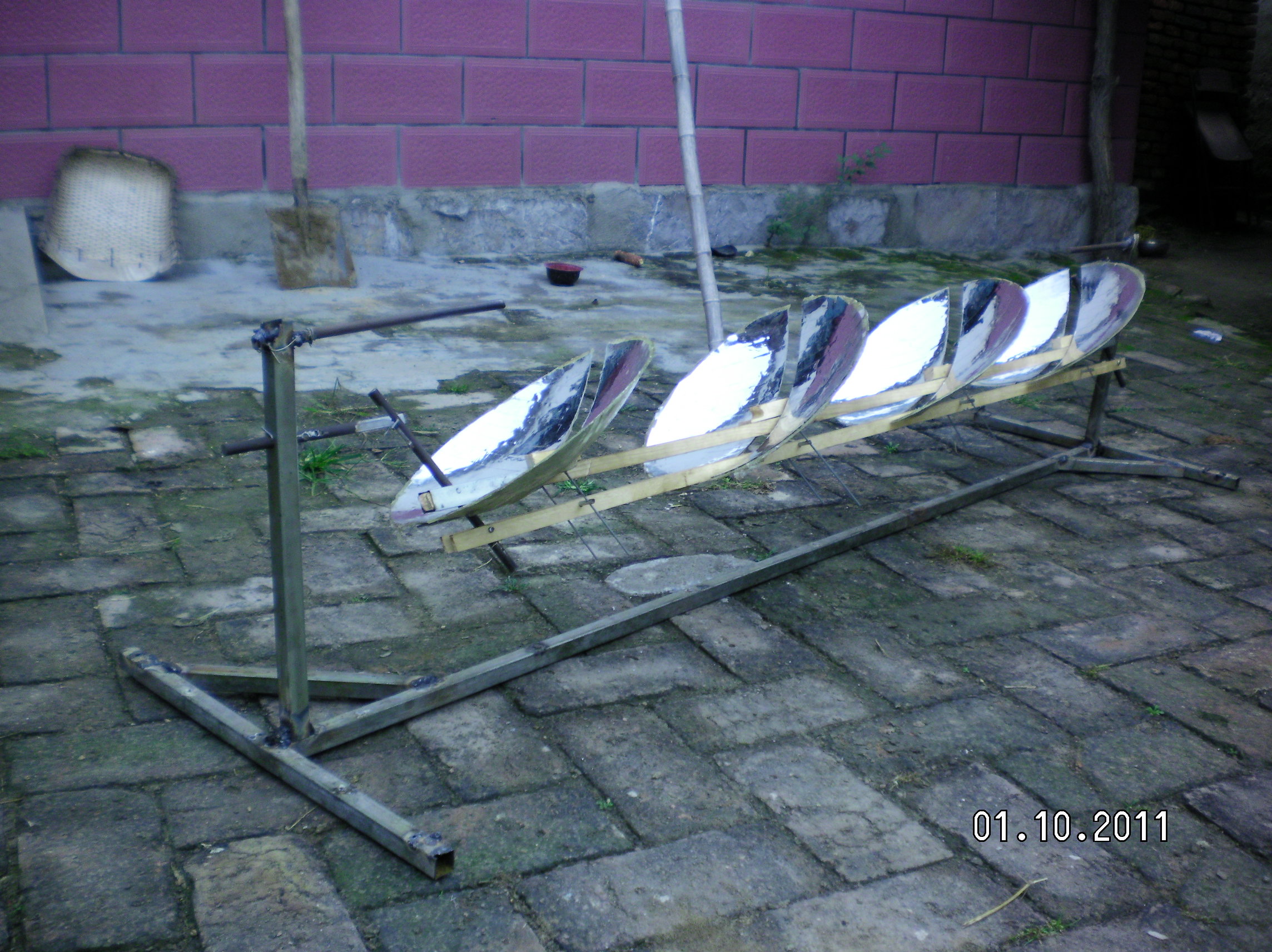 隨著全球環(huán)境惡化和日益嚴峻的能源形勢世界各國對太陽能熱發(fā)電越來越重視。現(xiàn)在最常用的太陽能熱發(fā)電系統(tǒng)主要有槽式、蝶式和塔式,槽式和蝶式的光熱部件必須隨聚光鏡做相應的運動,槽式各個光熱部件復雜昂貴,蝶式光熱部分只能單獨使用塔式的受熱部分出現(xiàn)故障很難維修這三種系統(tǒng)都有自己的缺點?;诖宋以O計了平行定焦太陽能聚光集熱發(fā)電系統(tǒng):主要有一對支柱.一對轉(zhuǎn)軸.一對動臂.旋轉(zhuǎn)拋物面聚光鏡.一根托桿.一根平行桿.平行連桿組成將兩支柱固定在一條直線上,兩轉(zhuǎn)軸安裝在兩支柱上兩轉(zhuǎn)軸可以左右轉(zhuǎn)動,兩動臂安裝在兩轉(zhuǎn)軸上使可以隨轉(zhuǎn)軸左右前后擺動。托桿安裝在兩動臂上,平行桿與托桿平行安裝在兩動臂上,這樣動臂.托桿.平行桿構成一個平行凹框。在旋轉(zhuǎn)拋物面鏡原點安一橫軸并切去部分旋轉(zhuǎn)拋物面鏡,在橫軸兩端垂直安裝兩根平行連桿,把旋轉(zhuǎn)拋物面鏡的橫軸安裝在托桿上。在平行桿上安裝連桿軸把平行連桿與連桿軸連接在一起。所述旋轉(zhuǎn)拋物面鏡的焦距等于托桿與轉(zhuǎn)軸之間動臂的長度。將動臂對準太陽陽光就會聚焦到固定點上在這些位置安裝光熱部件就會得到熱能用于熱發(fā)電。這種結構是雙軸定焦所以效率很高,抗風性好。這種結構可以做成很小裝在高在15-20cm的透明罩內(nèi)安裝在樓頂或樓房南墻上,為人們提供開水或蒸汽。請看模型照片: