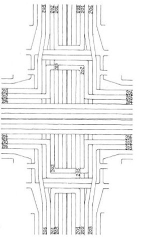 左轉(zhuǎn)彎車道的三層立交設(shè)計(jì),兩橫向左轉(zhuǎn)彎車道202分別通過(guò)兩縱向路面橋?qū)崿F(xiàn)無(wú)交叉左轉(zhuǎn),橫向左轉(zhuǎn)彎車道分別穿越縱向路面橋上的縱向左轉(zhuǎn)彎高架車道。兩縱向左轉(zhuǎn)彎車道分別通過(guò)兩縱向路面橋上的高架車道實(shí)現(xiàn)無(wú)交叉左轉(zhuǎn)。右轉(zhuǎn)彎車道為高架,跨越縱向路面橋上的縱向電動(dòng)車道人行道。各調(diào)頭車道進(jìn)出路口均為水平方向,車輛在同一平面行駛,左轉(zhuǎn)調(diào)頭,橫向調(diào)頭車道進(jìn)入路口至縱向路面橋左轉(zhuǎn)調(diào)頭,縱向調(diào)頭車道跨越橫向電動(dòng)車道人行道左轉(zhuǎn)調(diào)頭,中間穿越縱向高架橋。