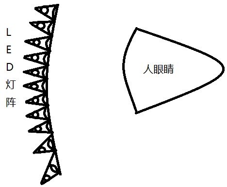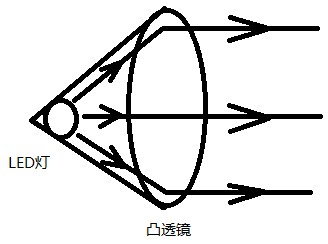 為了解決由于距離近無法看清圖像的問題,我利用用凸透鏡把每個LED燈的光線都由發(fā)散光聚焦,但并不是聚焦為平行光,而是仍略有發(fā)散,使人眼能夠看清圖像。這樣做的目的是防止不同使用者戴眼鏡位置不同而可能發(fā)生的看不清圖像的問題。如圖: