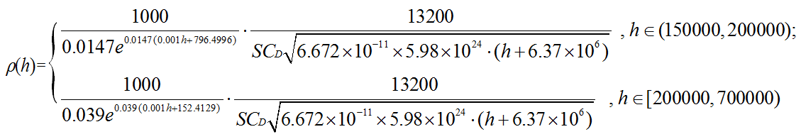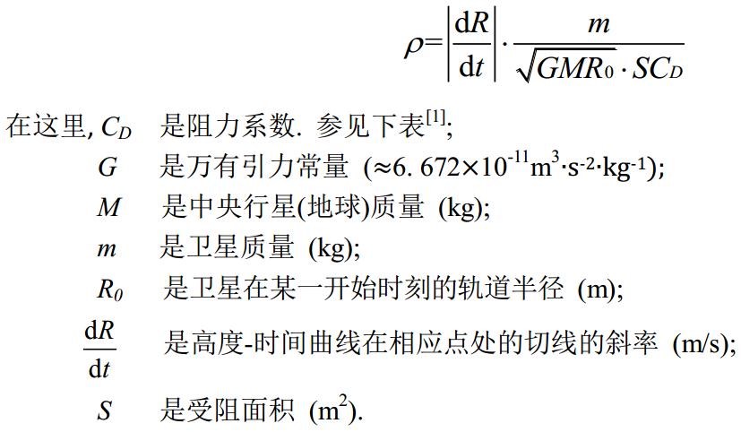 這種模式是否具有實用意義主要取決于離子在工作環(huán)境中是否充足, 即是說, 我們首先必須先測出高層大氣的近似的密度. 又因為它太小, 無法直接測量, 我就想出一種間接的方法: 通過測量不受控制的近地軌道衛(wèi)星的軌道高度的自然衰減. 由于密度可由作用于衛(wèi)星上的大氣阻力大小求出, 這個阻力間接地體現(xiàn)在衛(wèi)星高度衰減上, 因此通過計算我們得出密度ρ (kg/m3 ):