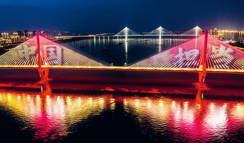 在抗擊新冠肺炎疫情的斗爭中,中國人民萬眾一心、眾志成城,凝聚起強(qiáng)大合力,展現(xiàn)了中國力量、中國精神、中國效率。圖為2020年5月2日晚,湖北武漢長江二橋燈光秀打出的“中國擔(dān)當(dāng)”畫面。 中新社發(fā) 趙廣亮/攝