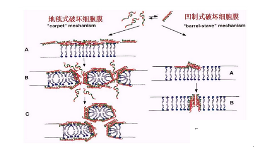 防御素抗菌的作用機(jī)理,目前有兩種不同的抗菌作用機(jī)理被提出,一種是獨(dú)立膜機(jī)制,另一種是防御素結(jié)合細(xì)胞內(nèi)復(fù)合物的機(jī)制。獨(dú)立膜機(jī)制的觀點(diǎn)認(rèn)為, 帶正電荷的防御素與帶負(fù)電荷的細(xì)菌細(xì)胞膜相互吸引,并相互結(jié)合,從而破壞了磷脂雙分子層的完整性,引起靶細(xì)胞膜出現(xiàn)裂隙??煞譃槿齻€階段:(1)由靜電吸引。防御素與靶細(xì)胞膜結(jié)合。防御素帶正電荷,可通過靜電作用與帶負(fù)電荷的細(xì)菌膜脂層結(jié)合;(2)通道形成。帶正電荷的防御素分子或其多聚體則與細(xì)菌質(zhì)膜上帶負(fù)電荷的磷脂頭部和水分子相互作用,顯著地增加生物膜的通透性。防御素作用于膜上形成穩(wěn)定的多個通道;(3)內(nèi)容物外泄。通道形成后,防御素進(jìn)入細(xì)胞內(nèi)的同時,其他胞外分子也伴隨進(jìn)入(如肽、蛋白質(zhì)或無機(jī)離子),而靶細(xì)胞的重要物質(zhì)(如鹽離子和大分子)滲出,細(xì)胞膜的通透性及細(xì)胞能量狀態(tài)受到了破壞,導(dǎo)致細(xì)胞膜去極化,呼吸作用受到抑制以及細(xì)胞ATP含量下降, 離子和大分子物質(zhì)通過細(xì)菌的細(xì)胞膜, 最終導(dǎo)致靶細(xì)胞死亡。