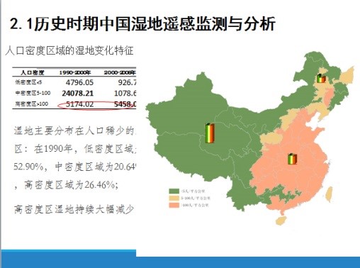 如圖,人口密度與區(qū)域濕地變化特征,過去30年期間每個時間段里都是減少速度最快的,人口比較少的區(qū),小于5個人的區(qū)間就比較少。濕地主要分布在人口稀少的地區(qū):在1990年,低密度區(qū)域為52.90%,中密度區(qū)域為20.64%,高密度區(qū)域為26.46%;高密度區(qū)濕地持續(xù)大幅減少。