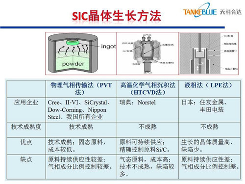 碳化硅襯底的生長方法有三種:一是物理氣相傳輸法,該技術相對成熟,性價比高;二是高溫化學氣相沉積法,優(yōu)點是原料可持續(xù)供應,可精確控制原料中的碳硅比;三是液相法,尚處于研究階段。
