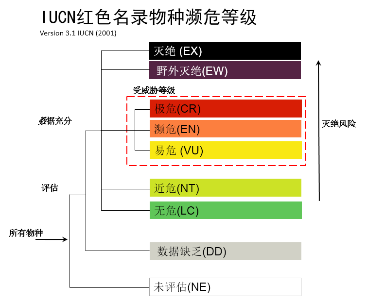 IUCN自20世紀(jì)60年代成立之日起,就設(shè)立了物種生存委員會(huì)(SSC),開(kāi)始編制和印刷《IUCN瀕危物種紅皮書(shū)》,后來(lái)隨著評(píng)估物種的增加,印刷版逐步發(fā)展為網(wǎng)絡(luò)版的《IUCN瀕危物種紅色名錄》,定期編制發(fā)布。IUCN/SSC研究制定了《IUCN物種紅色名錄瀕危等級(jí)和標(biāo)準(zhǔn)》,根據(jù)物種的種群數(shù)量和分布情況等,評(píng)估其生存狀況,確定其瀕危等級(jí)。IUCN瀕危物種等級(jí)標(biāo)準(zhǔn)分為“有評(píng)估數(shù)據(jù)”和“數(shù)據(jù)缺乏”兩類(lèi),“有數(shù)據(jù)評(píng)估”中又分為“滅絕”、“野外滅絕”、“區(qū)域滅絕”、“極危”、“瀕?!?、“易危”、“近危”和“無(wú)?!钡?個(gè)級(jí)別,從“無(wú)危”到“極?!?,滅絕風(fēng)險(xiǎn)逐步上升,瀕危等級(jí)逐步增加。瀕危等級(jí)標(biāo)準(zhǔn)有5個(gè)指標(biāo),分別是種群下降、有限地理分布區(qū)、下降小種群、非常小或非常有限的種群、以及模型模擬等量化分析,根據(jù)這些指標(biāo)的數(shù)量閾值,來(lái)評(píng)估物種的瀕危等級(jí)。