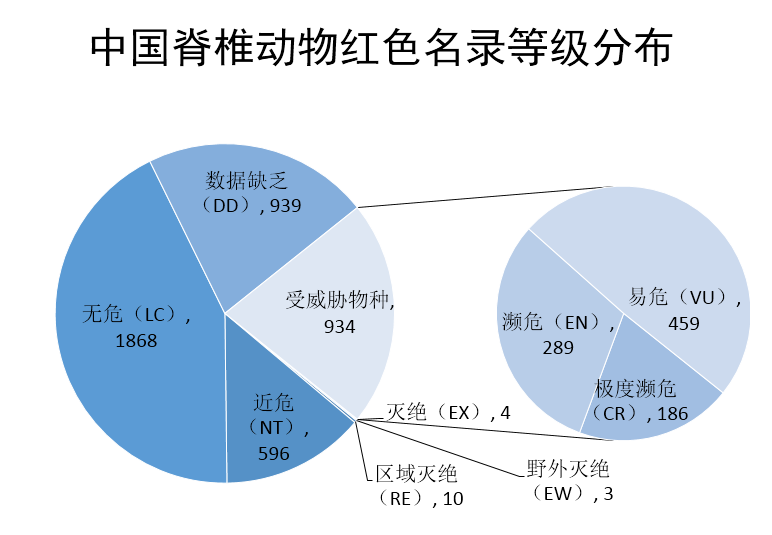 2015年完成的《中國(guó)生物多樣性紅色名錄-脊椎動(dòng)物卷》,共評(píng)估了中國(guó)4357種脊椎動(dòng)物,包括673種哺乳類(lèi),1372種鳥(niǎo)類(lèi),461種爬行類(lèi),408種兩棲類(lèi),1443種淡水魚(yú)類(lèi)。其中939種數(shù)據(jù)缺乏,1868種無(wú)危,596種近危,受威脅的物種共934種。在934種受威脅物種當(dāng)中,易危459種,瀕危289種,極度瀕危186種。受威脅的原因分析中,過(guò)度利用、生境喪失和人類(lèi)干擾是最主要的威脅因子。