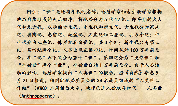 在2000年的一個(gè)國際會議上,1995年諾貝爾化學(xué)獎(jiǎng)得主保羅-克魯岑提出,當(dāng)今人類活動(dòng)對自然環(huán)境的影響已經(jīng)超過了自然狀態(tài)的變化,應(yīng)該定義一個(gè)新的地質(zhì)時(shí)代,叫人類世。我國科學(xué)家劉東生院士參加了此會,回國后就極力推薦這個(gè)詞。