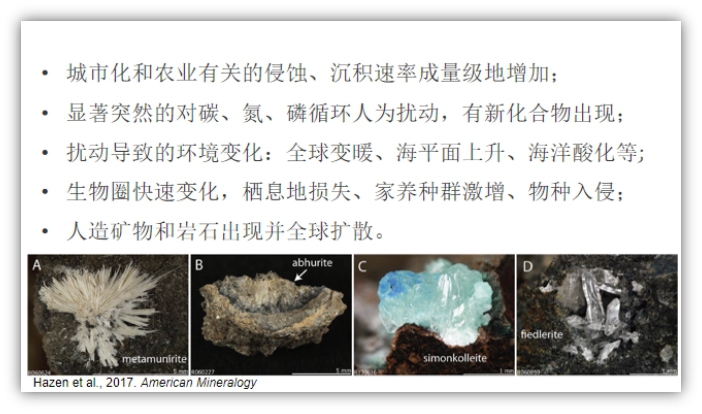 國際地層委員會的人類世工作組工作了10年,總結(jié)了一些現(xiàn)象,如城市化和農(nóng)業(yè)的侵蝕、沉積速率成量級地增加,顯著而突然的對碳、氮、磷循環(huán)的人為擾動(dòng),產(chǎn)生一些新的化合物,使得生物圈出現(xiàn)快速變化、棲息地的損失帶來植物多樣性的降低、馴化生物種群大規(guī)模增加,人類的遷徙活動(dòng)等等。