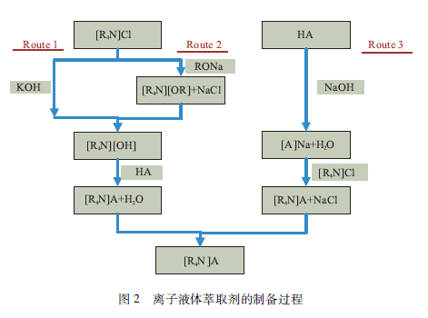 離子液體萃取劑的制備過程如圖2所示,包括將季錢鹽[R4N ]C1制備成季錢堿[R4N ]OH,然后與有機酸HA反應(yīng)生成[R4N]A?;蛘邔⒂袡C酸HA與堿反應(yīng)生成A一Na,然后與[R4N ]C1反應(yīng)生成[RQN]A。前一個制備過程,尤其是利用KOH更加簡單、低成本,產(chǎn)品的純度高。此外,離子液體萃取劑制備過程簡單,反應(yīng)時間短,條件溫和,產(chǎn)品收率高,適合大規(guī)模的生產(chǎn)。申請者利用工業(yè)原料N263 ( Aliquat336的國產(chǎn)化的商品)與P507制備的[A336][P507]價格僅為170元/千克左右。另外,離子液體萃取劑性質(zhì)穩(wěn)定,經(jīng)過多次循環(huán)仍保持其萃取性能。此外,其水溶性較低,溶解度一般小于50ppm。這些都符合大規(guī)模工業(yè)應(yīng)用的潛在條件。