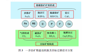 為實現(xiàn)上述目標,弱磁鐵礦磁化與稀土礦物分解一步法礦物重組機制及目標遷移設(shè)計方案如圖3所示。